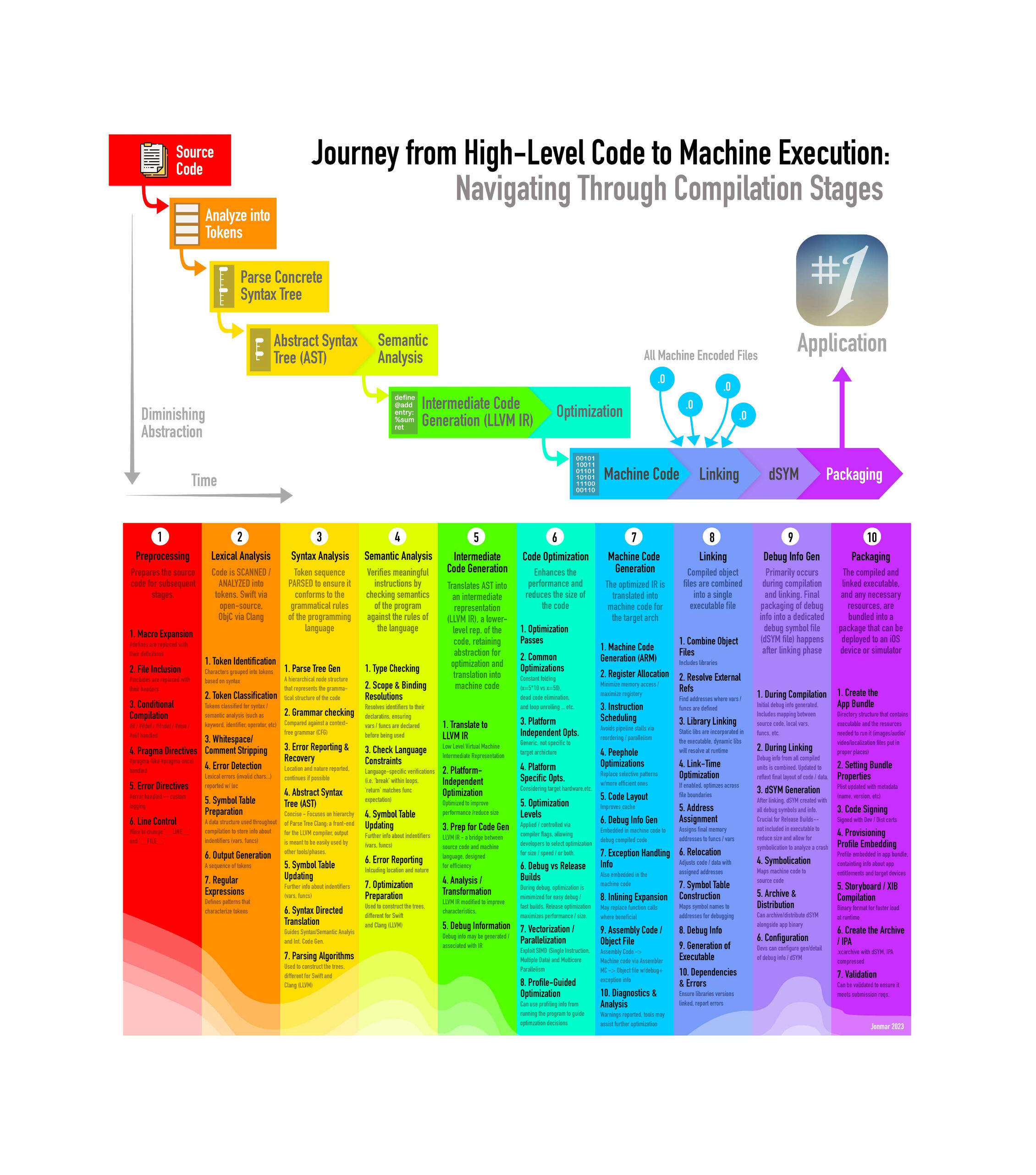 Researched the compile time process for iOS applications to share with a client the critical impact of poor code on build times. Created the infographic below. This was coupled with a white paper that showed what both good and bad code look like at each stage of the process, to better understand the CPU burn that happens as bad code bloats through the 10 steps.• Included examples of code smells that lead to bloat and how to solve them.• Was one element of an overarching optimization that can speed up build times by 50%.